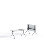 01/ Tavoli riunione pieghevoli a libro in 2 formati. 02/ Piani in spessore 25 mm.
